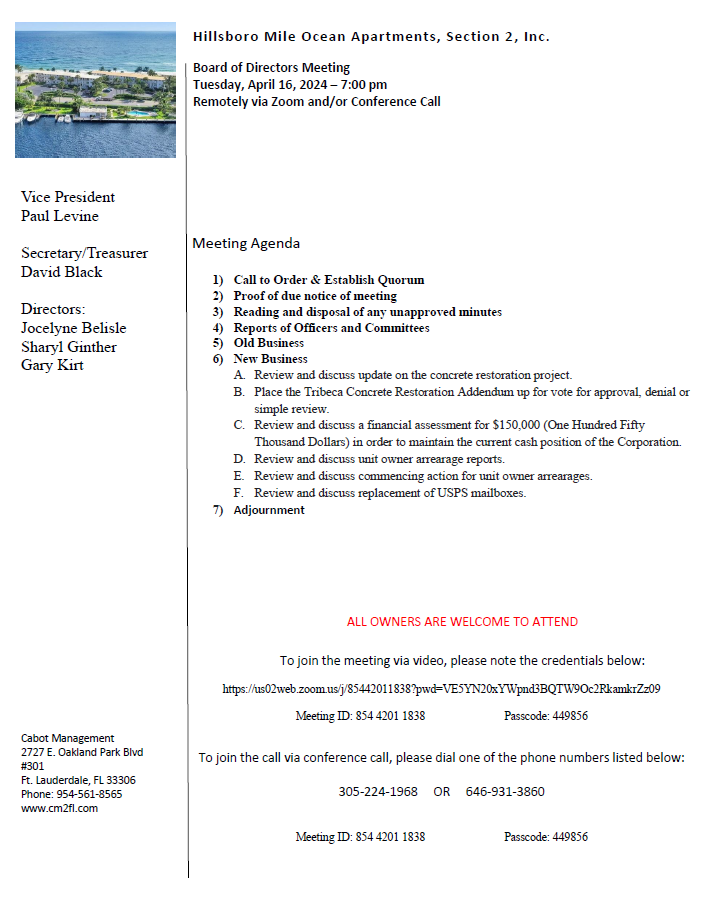 Please be advised that there will be a Board Meeting tonight at 06:00PM. All owners are welcome to attend. Questions and answers at the end of the meeting.