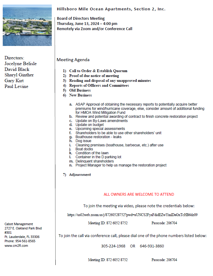 Board Meeting to be held today June 12, 2023 at 6:30pm